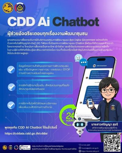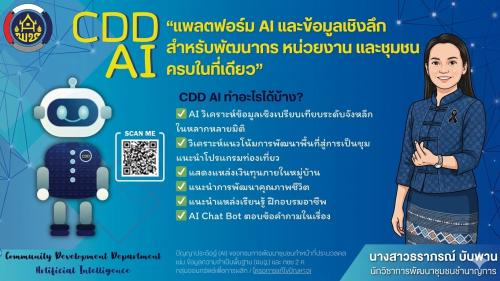 ระบบ CDD AI เป็นนวัตกรรมปัญญาประดิษฐ์ที่พัฒนาขึ้นเพื่อช่วยสนับสนุนการทำงานของเจ้าหน้าที่พัฒนาชุมชน ผู้นำชุมชน และประชาชน โดยครอบคลุมการทำงานในหลายมิติ ได้แก่